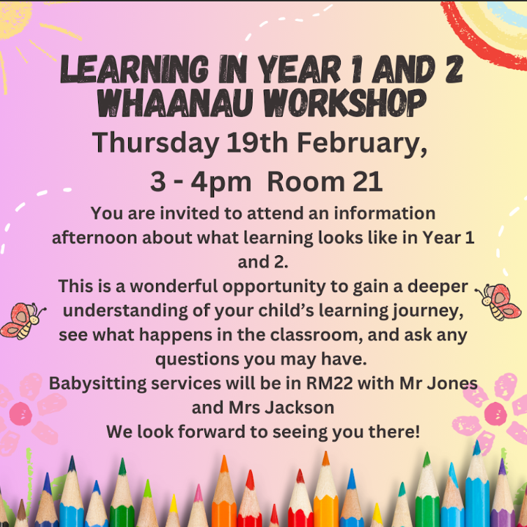 Just a reminder that the teachers of Year 1 and 2 would like to invite their whaanau to a workshop looking at learning in the Junior School. The workshop will be tomorrow, 19 February at 3.00pm. Child minding will be provided and the venue is Room 21.